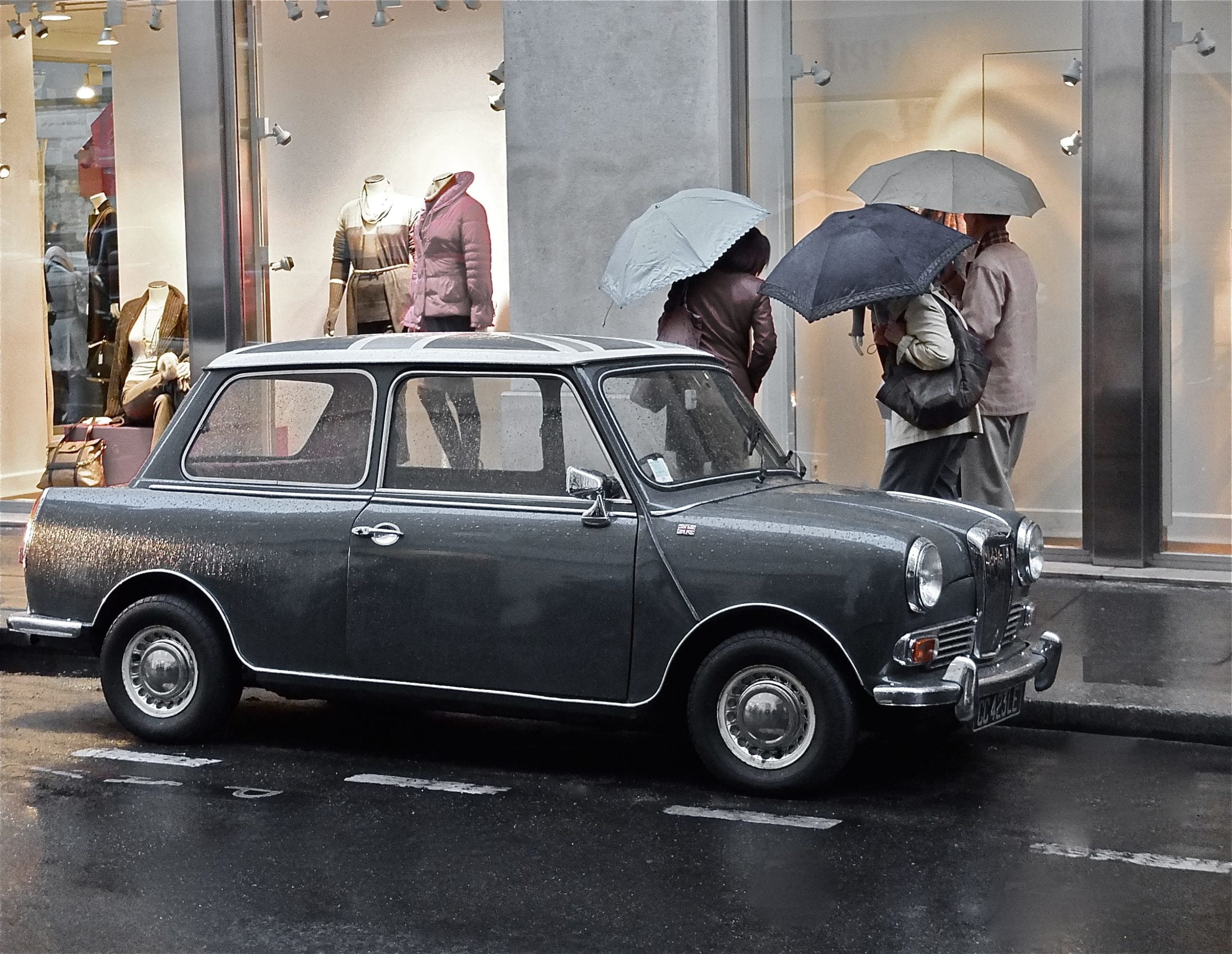 Hier en promenade dans les jolis quartiers de Paris, je suis tombée sous le charme de celle-ci. L’intérieur était en cuir bordeaux (LA couleur tendance de cet hiver !) et elle arborait deux Union-Jack en couleur sur ces deux ailes et un énorme en gris & blanc sur son toit. Une petite merveille.