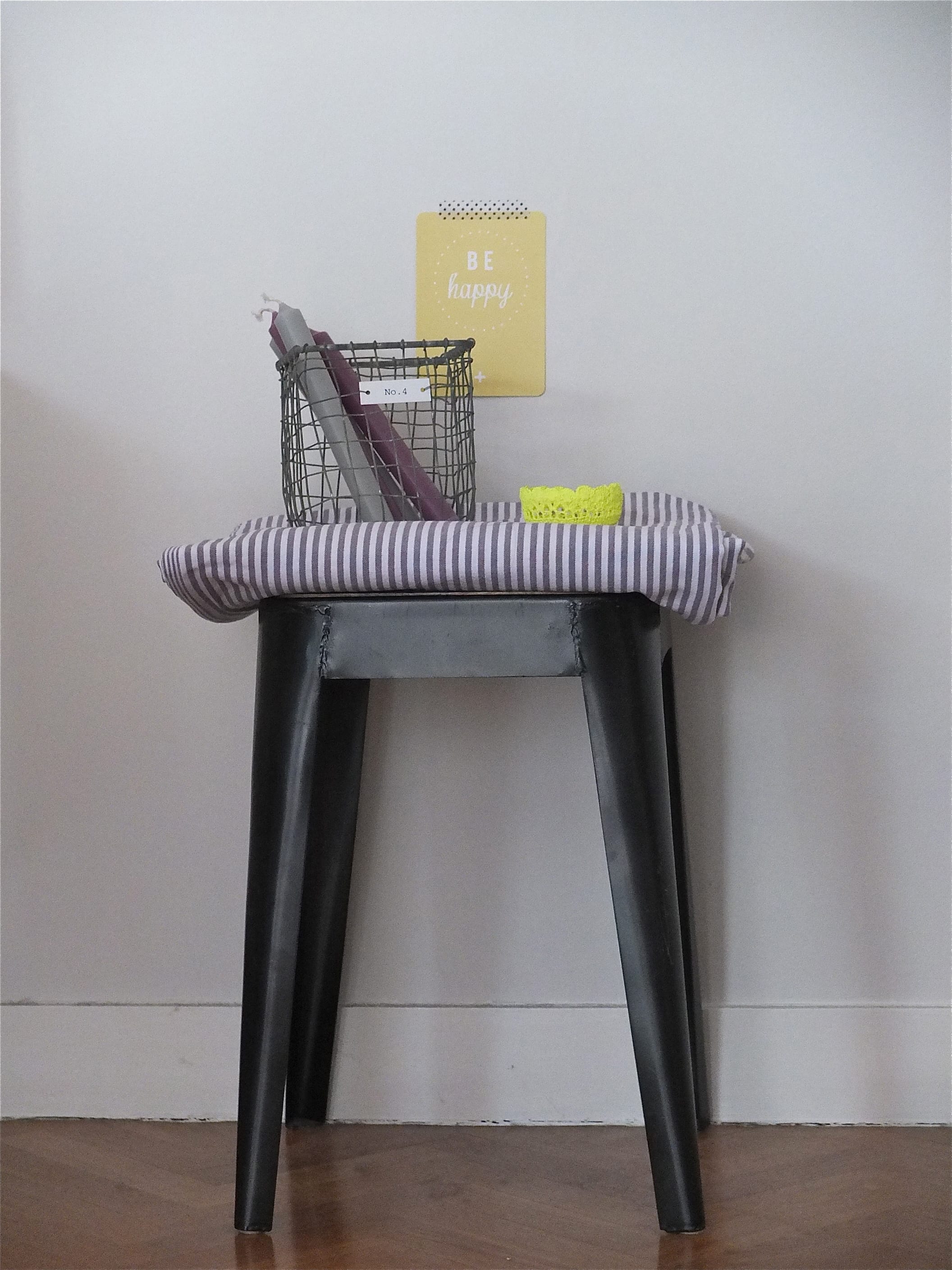 (mini corbeille neon, casier en fer House Doctor et carte Be happy)