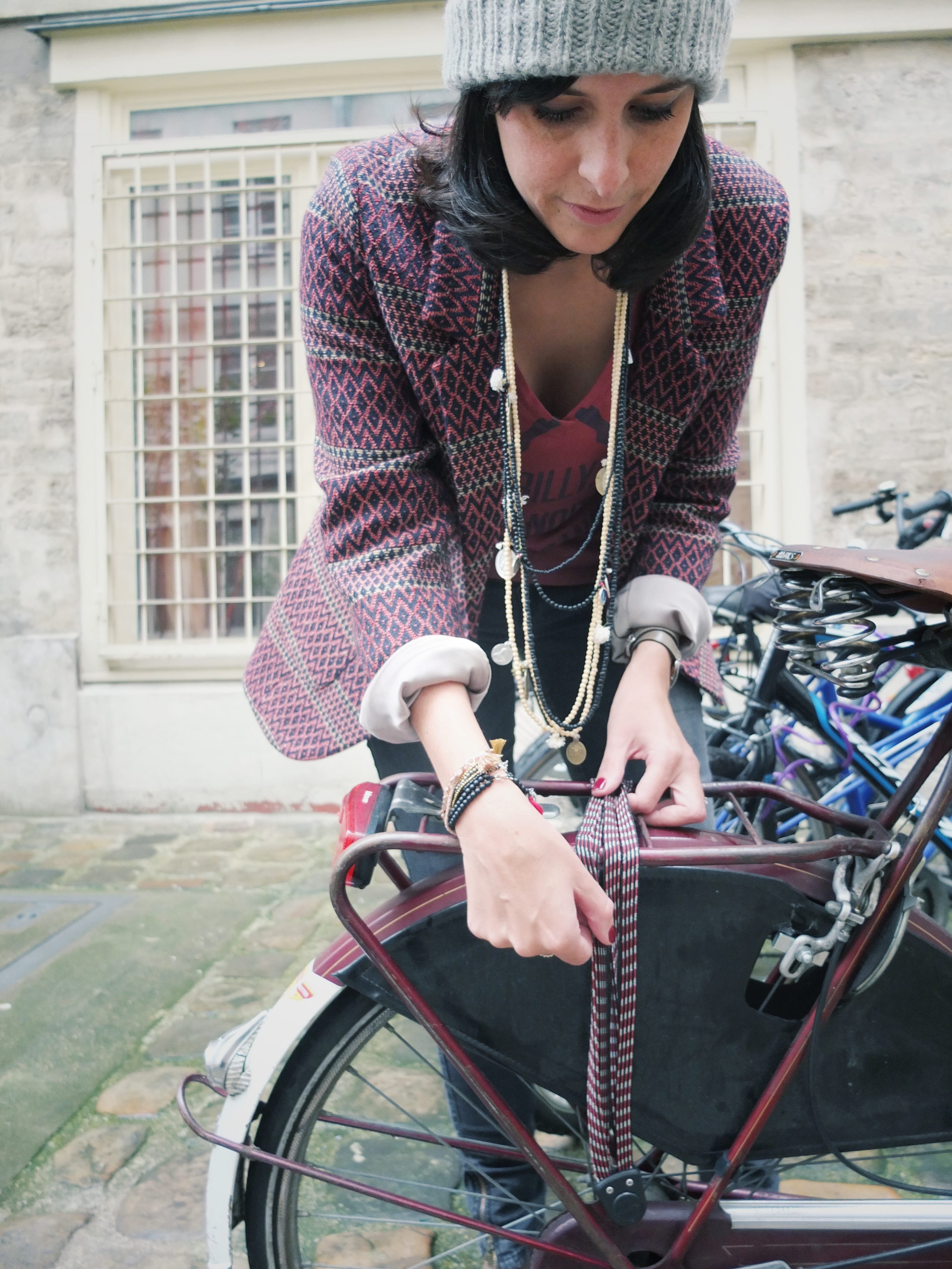 Ceux qui me connaissent vont le savoir tout de suite : non ! je ne me suis pas mise au vélo mais ce vélo vintage, de surcroit arborant ma couleur préférée le bordeaux, s’est prêté au jeu (on remercie son ou sa proprio) !
