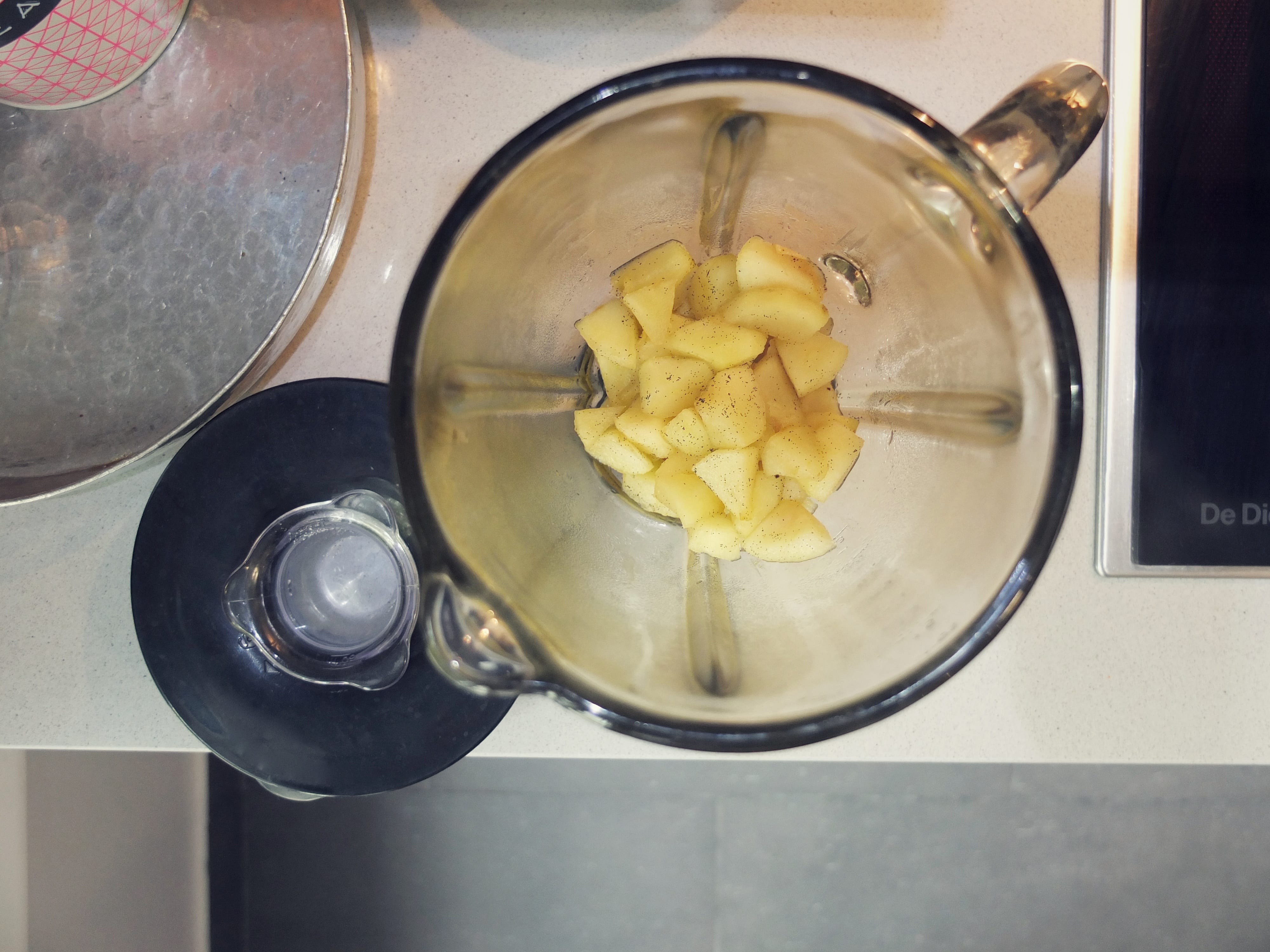 > Passez au mixeur pour obtenir une compote, puis tapissez le fond de la pâte à tarte de votre compote pommes/vanille (attention à ne pas tout manger !)