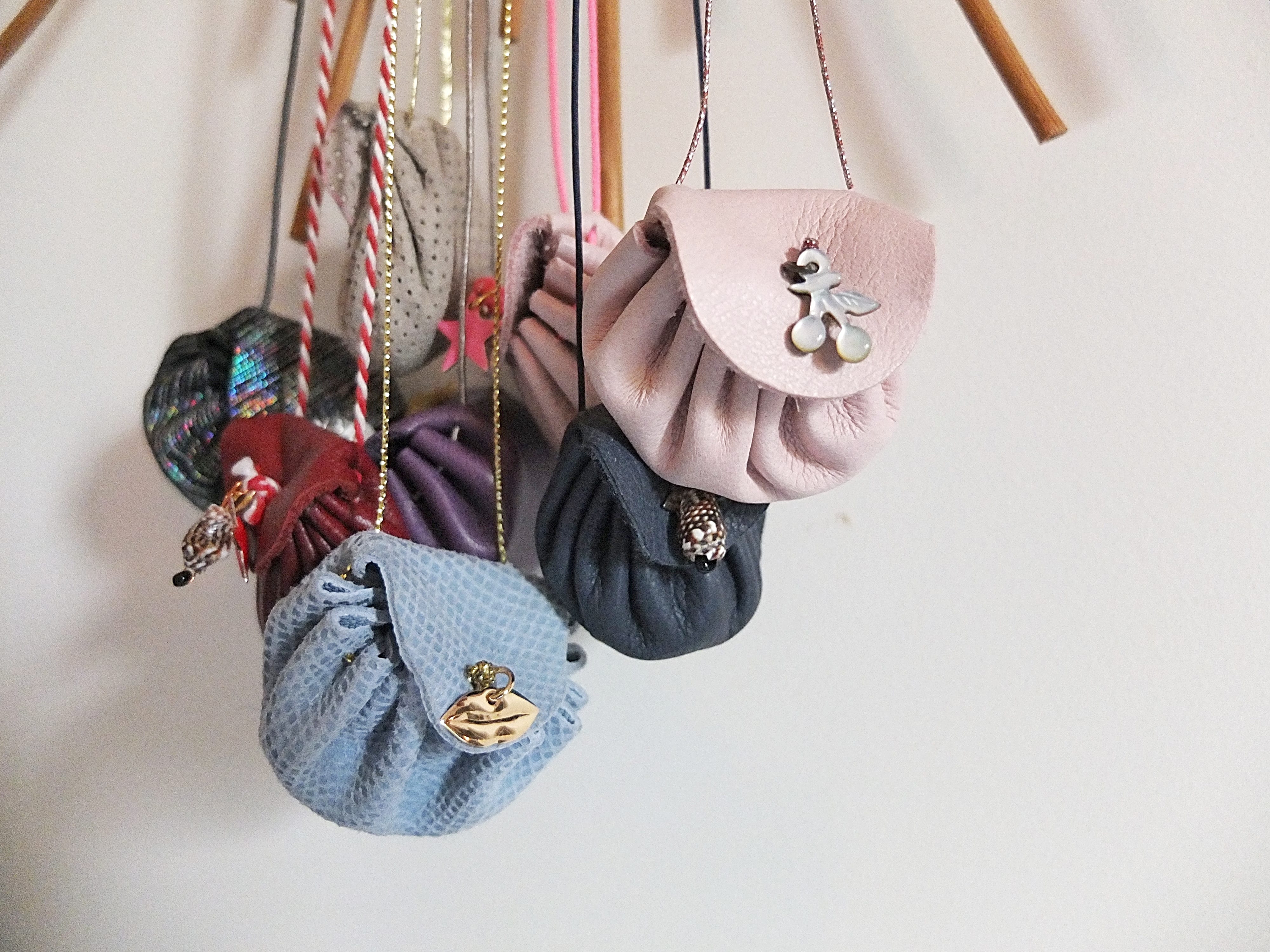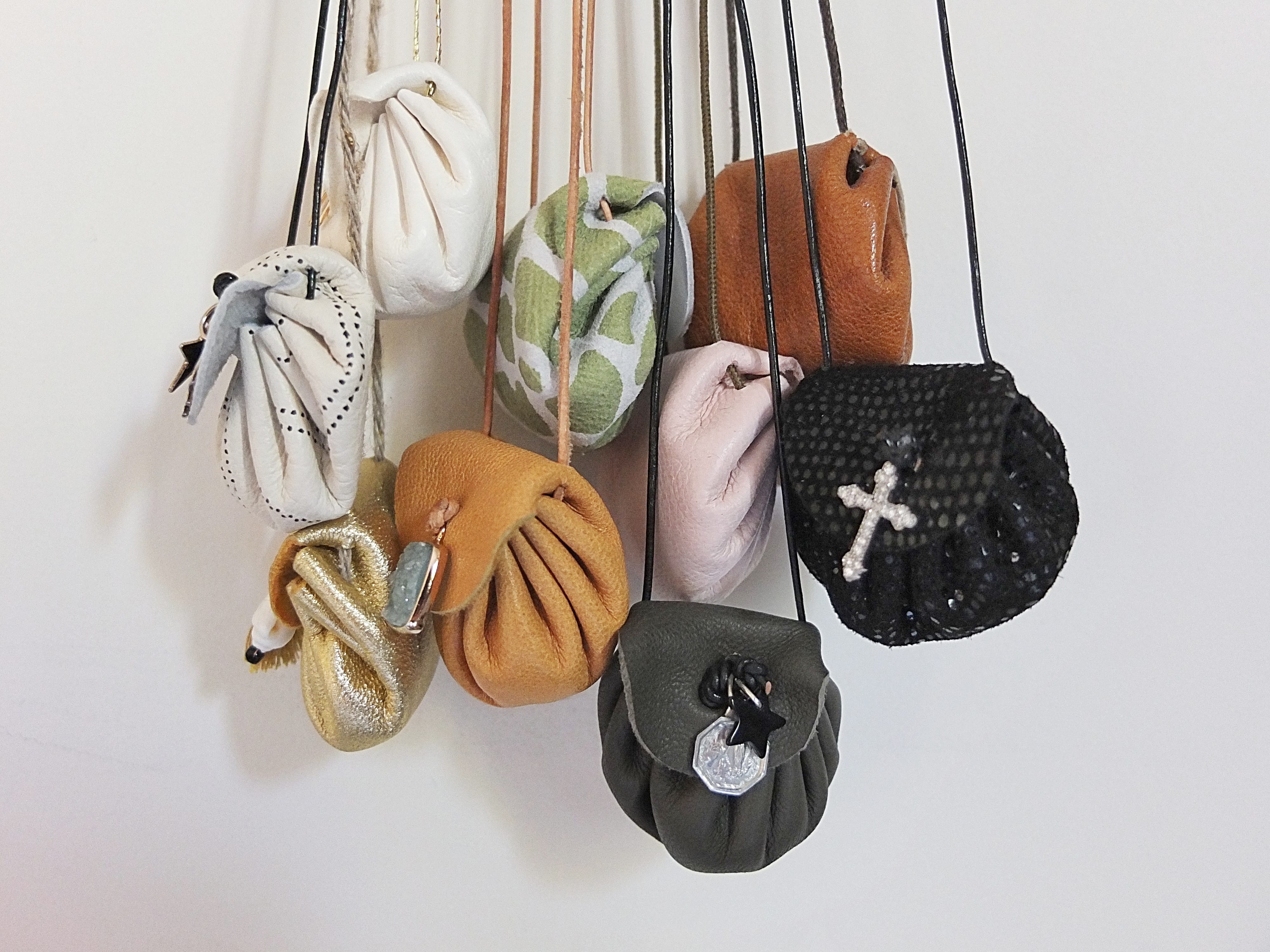 Laurence propose une collection de sautoirs « petites bourses » réalisés dans de très beaux cuirs vintages et fabriqués dans son atelier parisien. Ce que j’adore,  c’est qu’il s’agit de pièces uniques (vous pouvez demander aussi du sur-mesure) et dans chaque sautoir se trouve une petite pierre vertueuse !