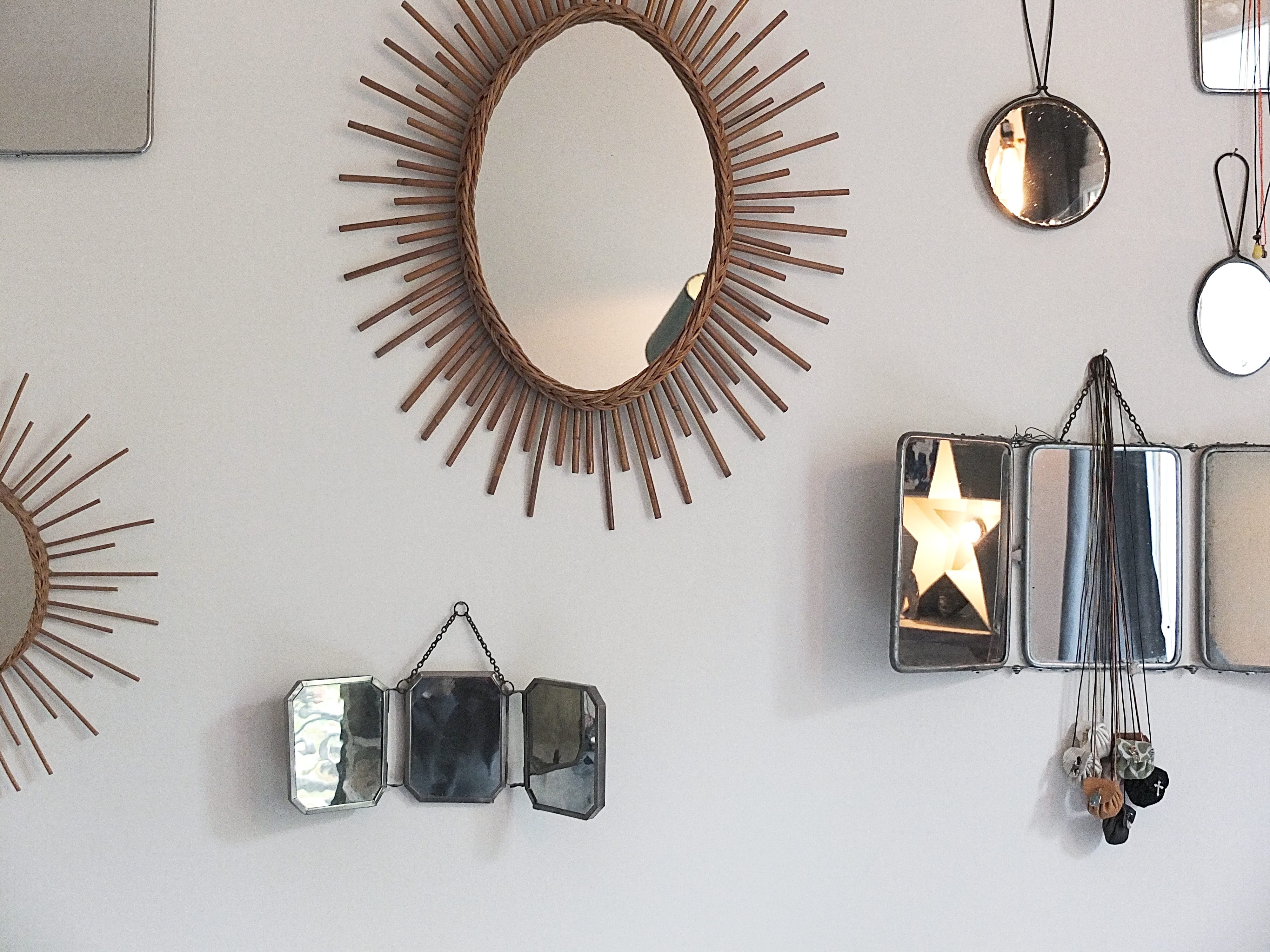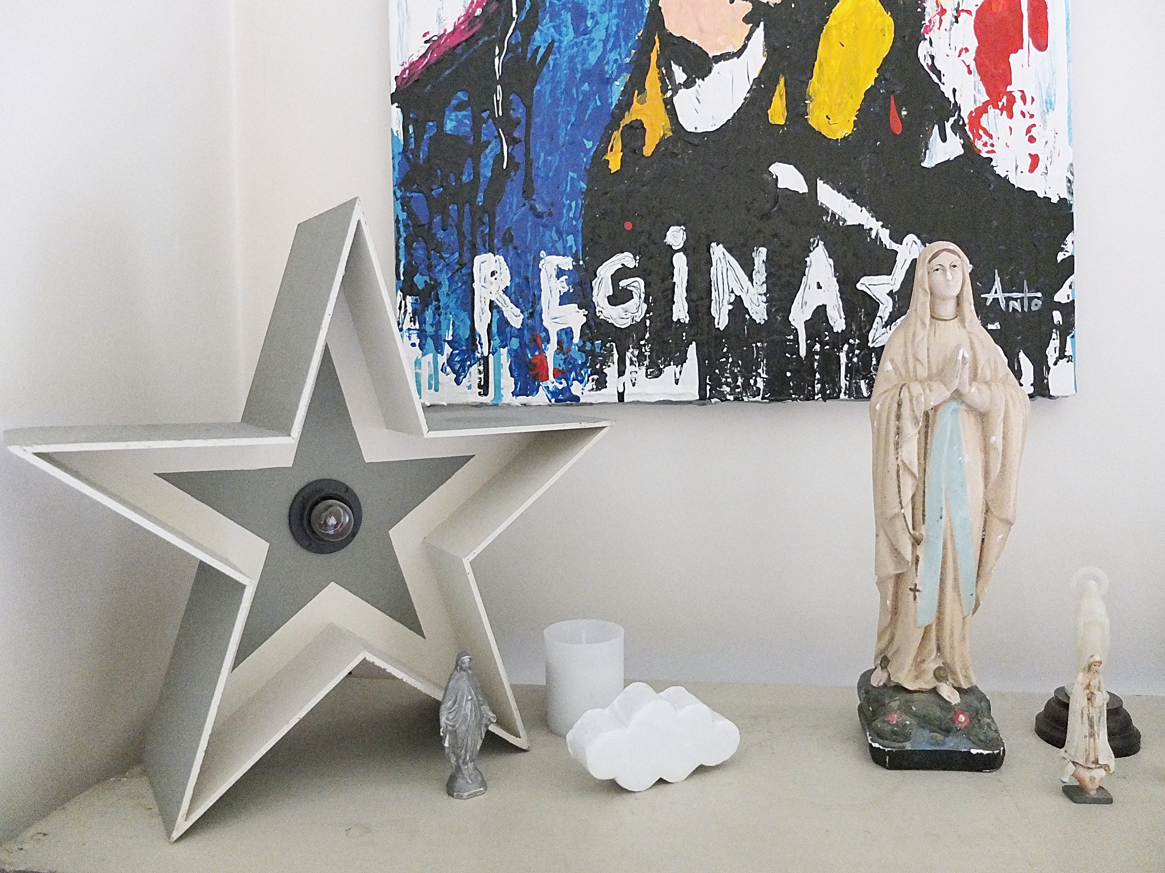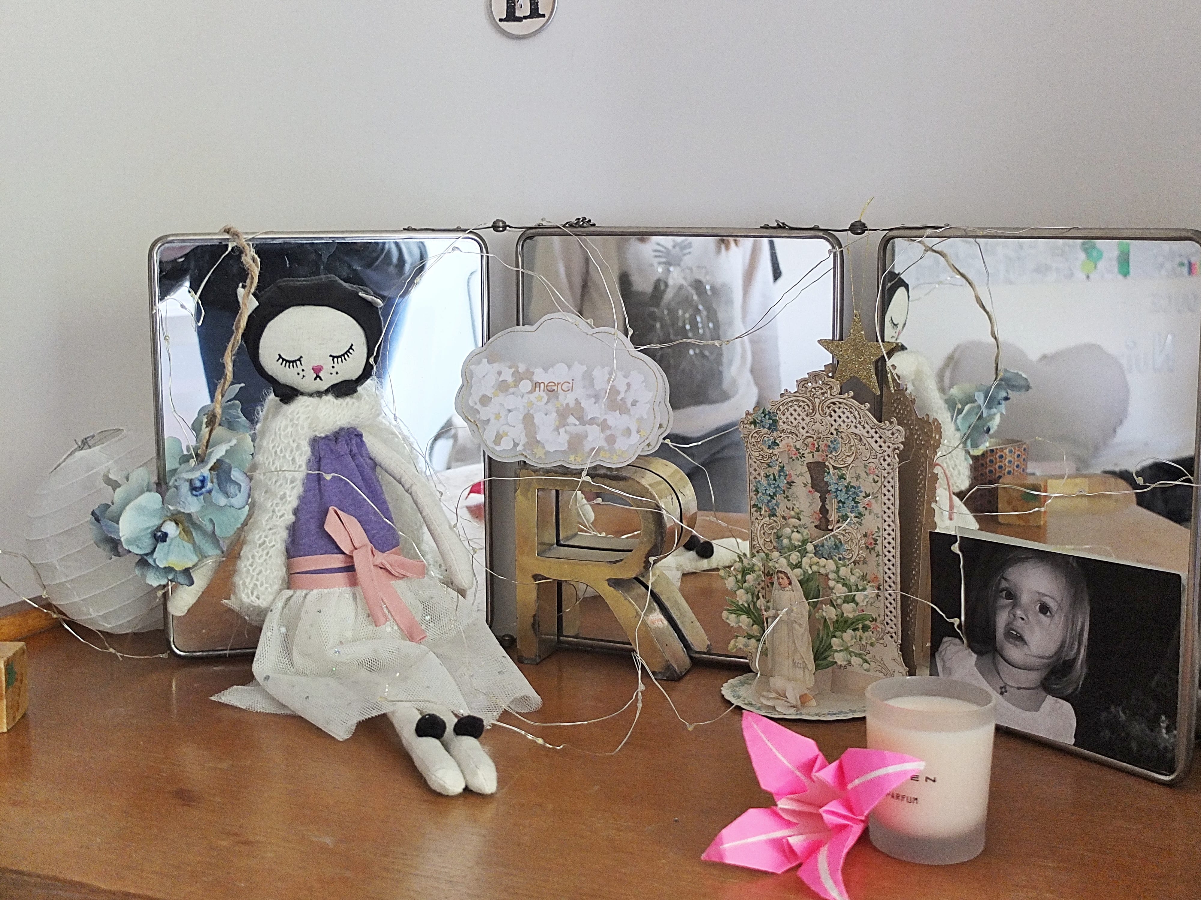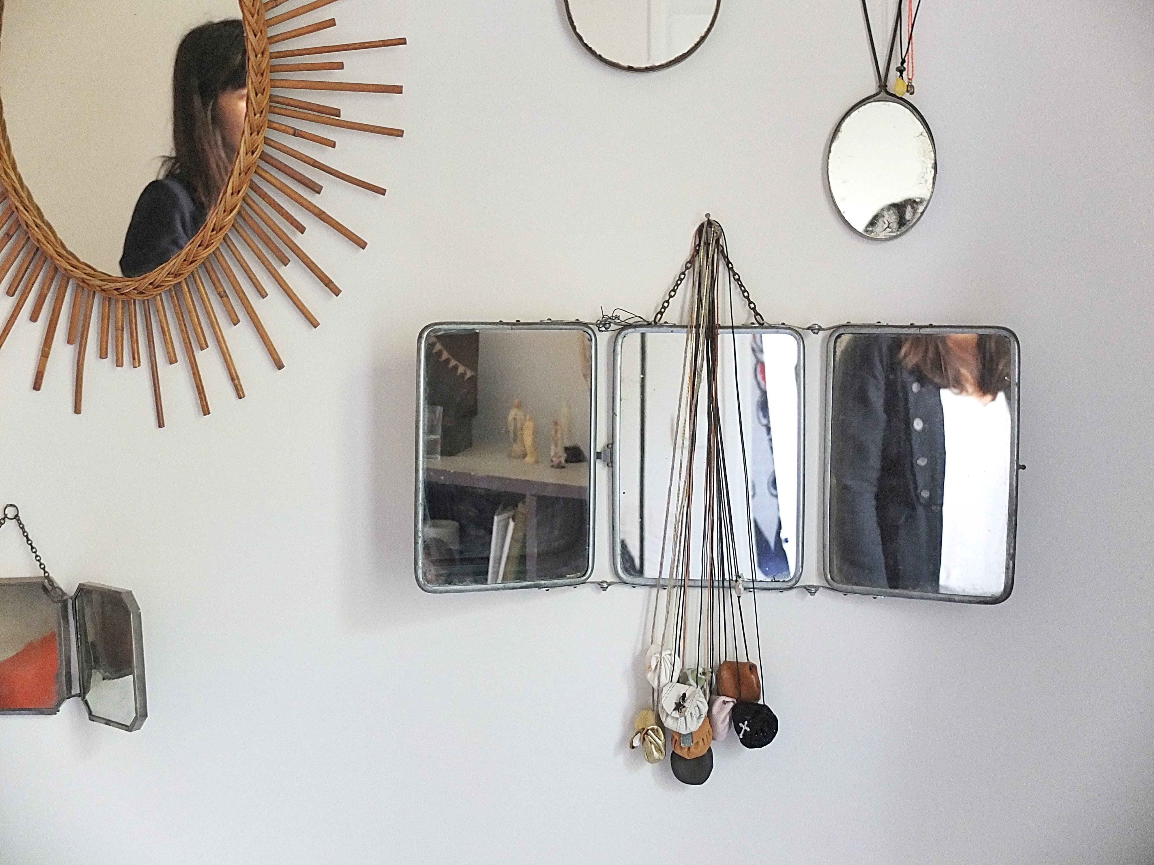 Les idées à retenir : les étoiles qu’elles soient lumineuses ou en métal, la collection de petites Saintes Vierges ou encore de bénitiers, les bougies de plusieurs tailles, le marche pied en bois vintage pour déposer vos reliques favorites ! ou encore mur de miroirs chinés !