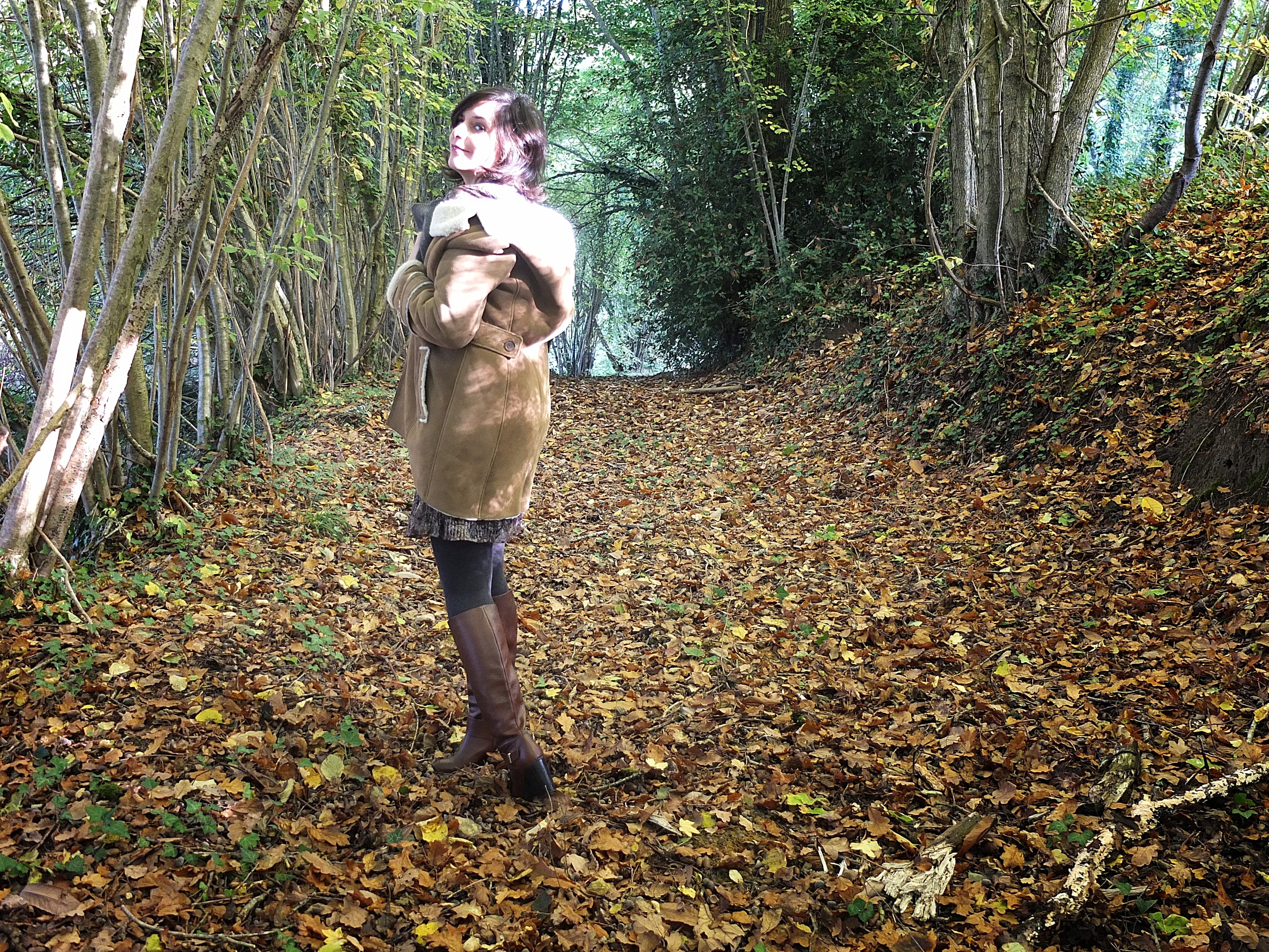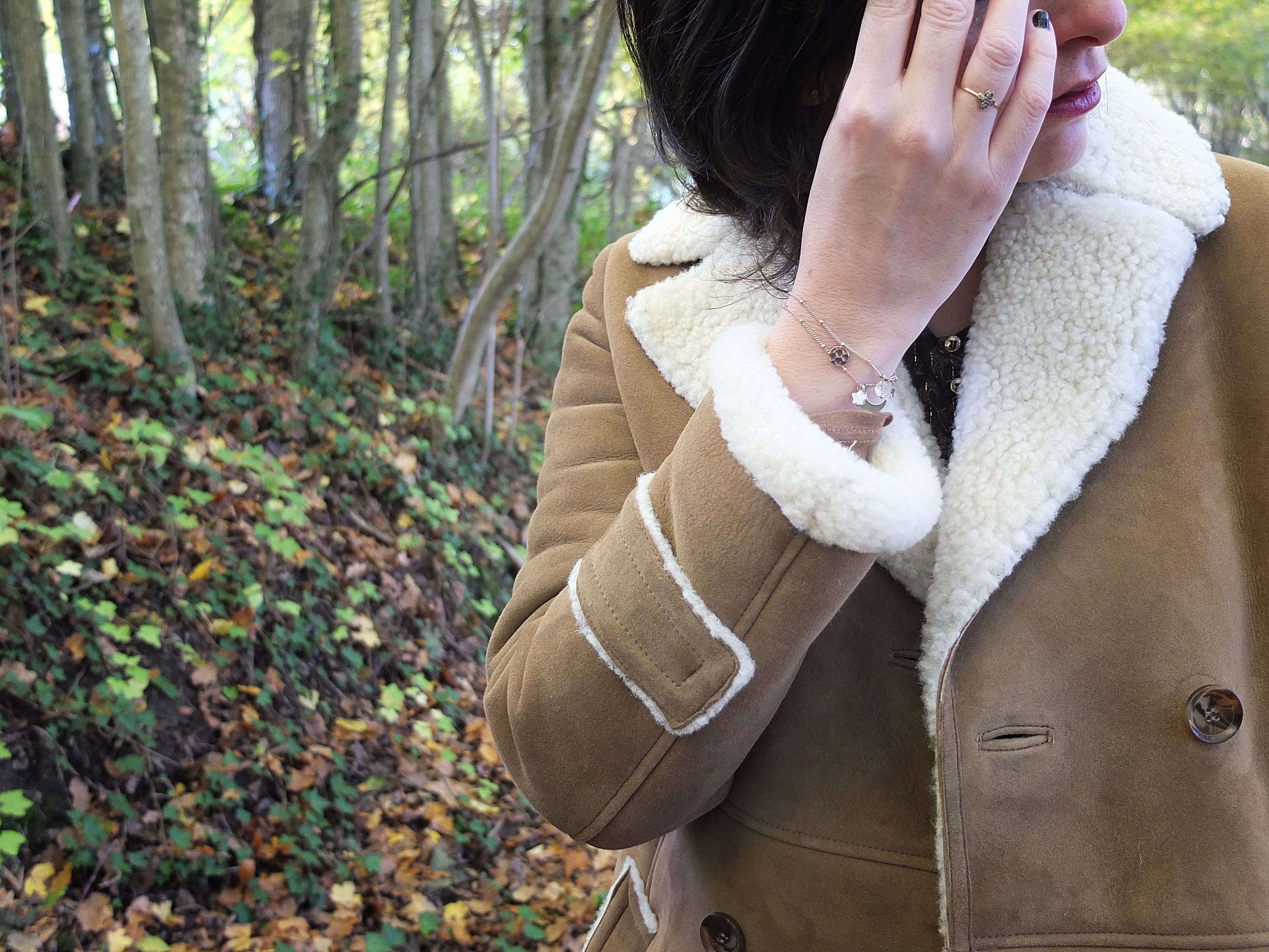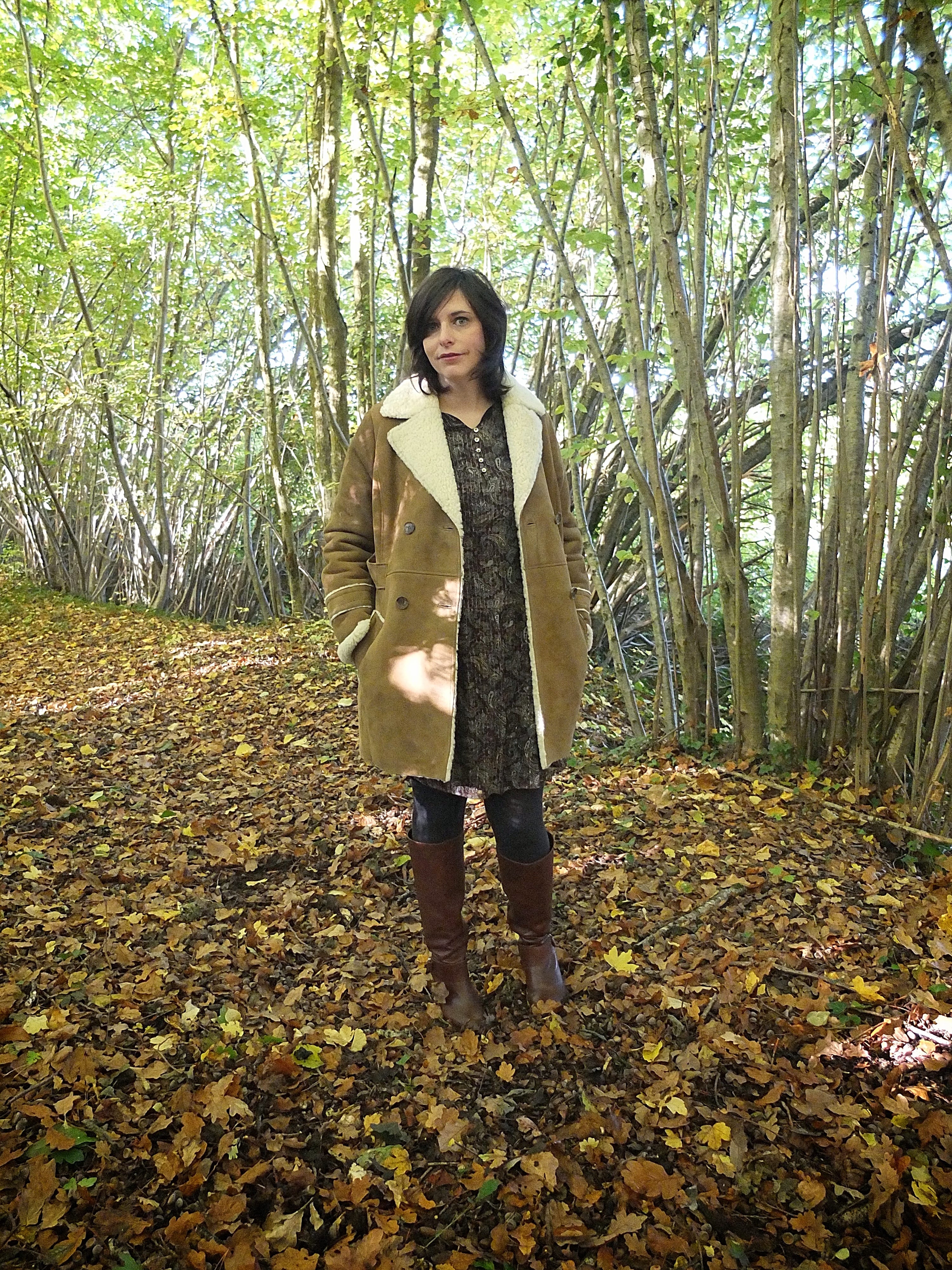 Pour ce look, j’ai voulu accentuer le côté vintage de cette peau lainée Comptoir des Cotonniers avec une robe en lurex et mes bottes marrons-cognac.