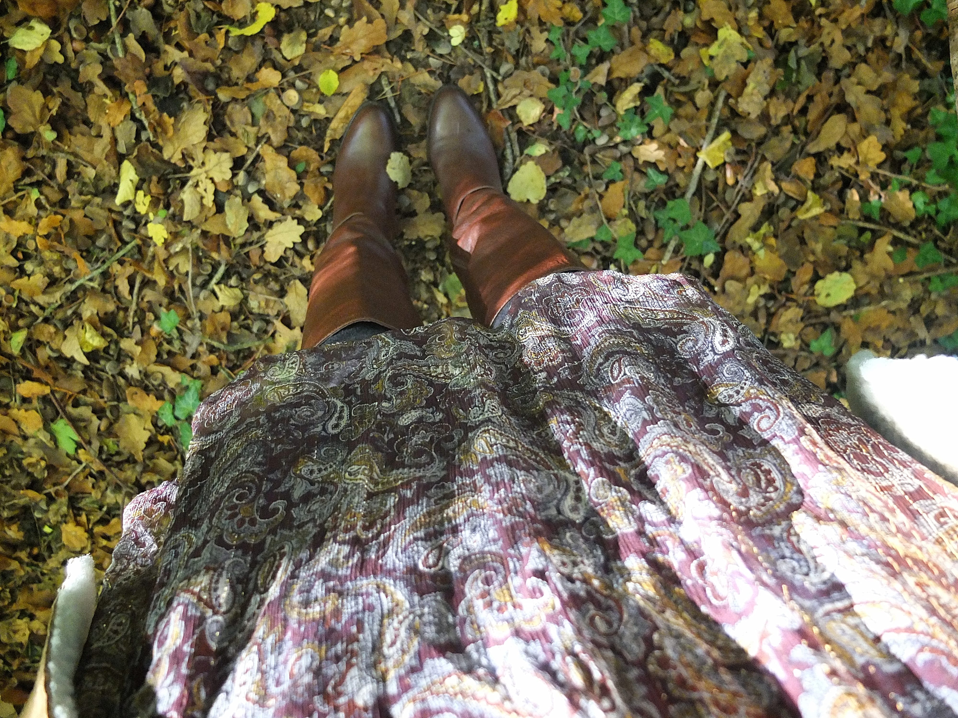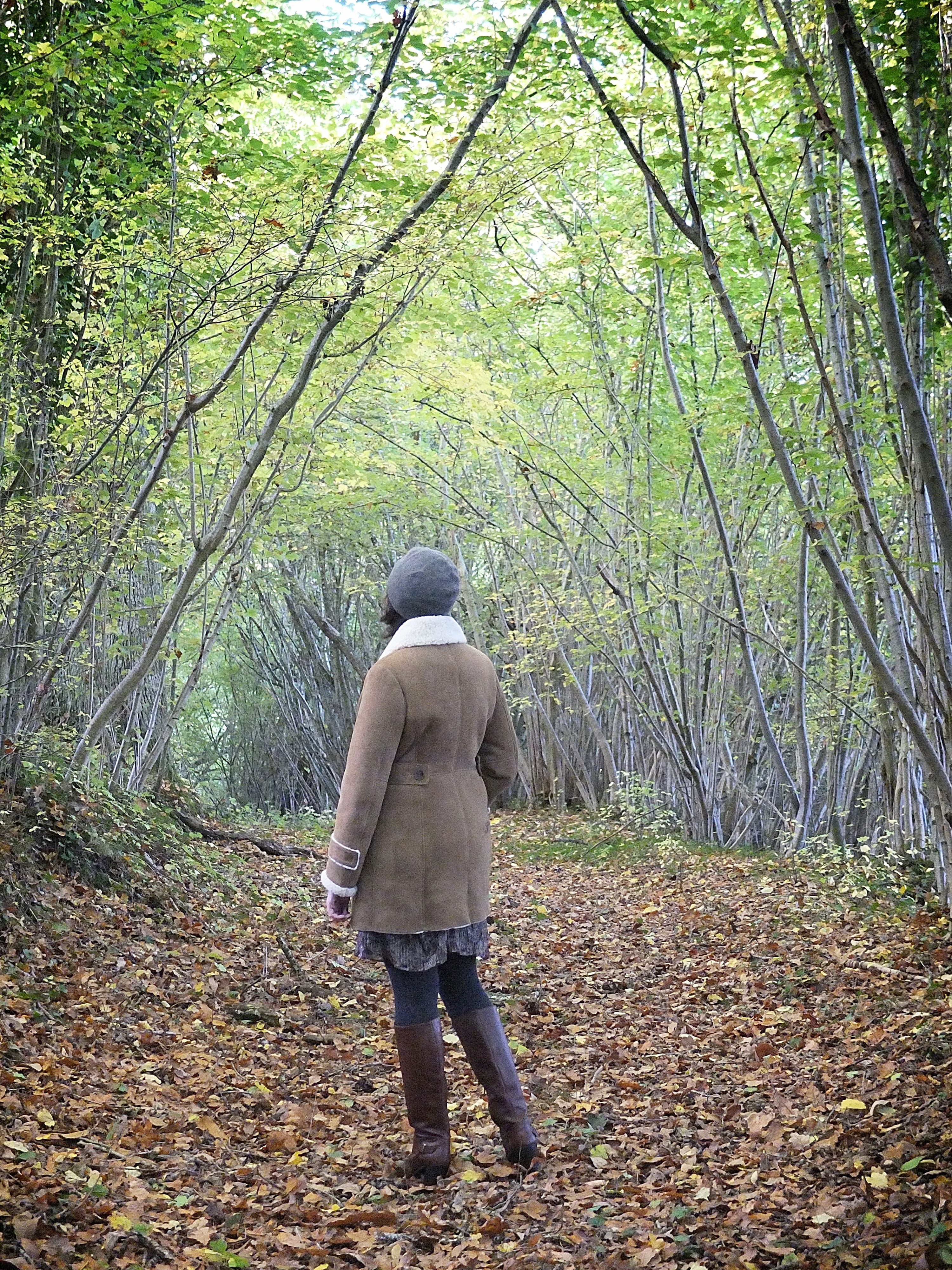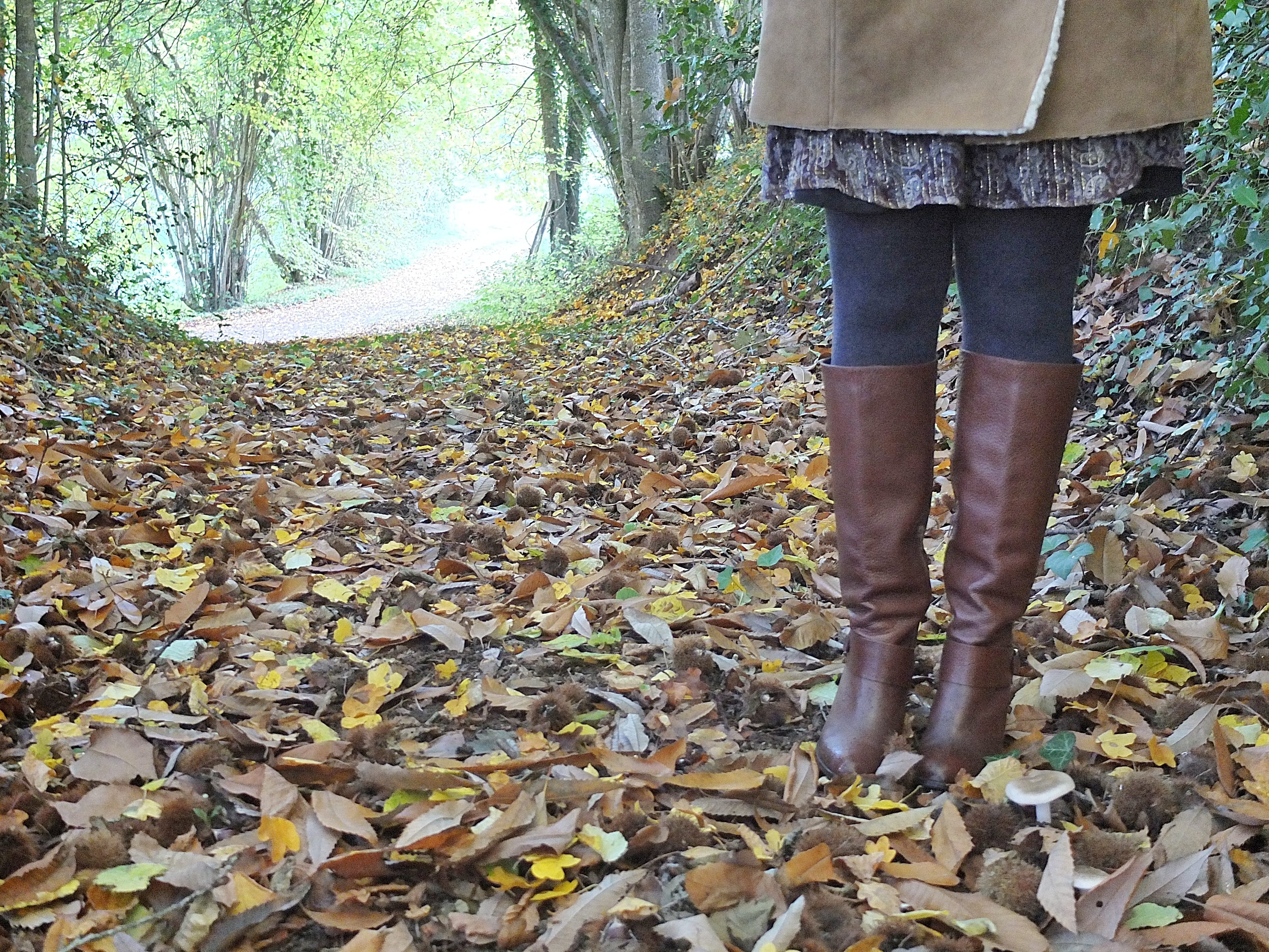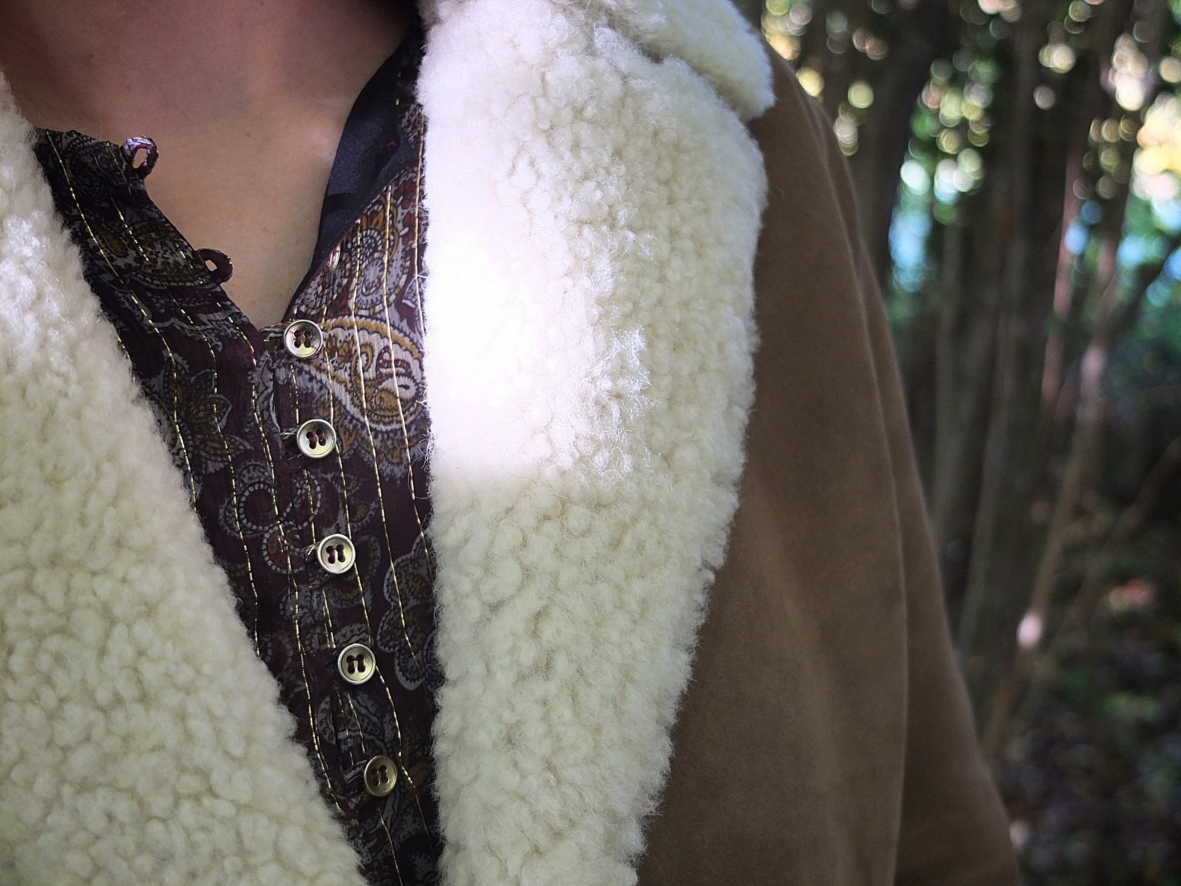 Pour ce look, j’ai voulu accentuer le côté vintage de cette peau lainée Comptoir des Cotonniers avec une robe en lurex et mes bottes marrons-cognac.