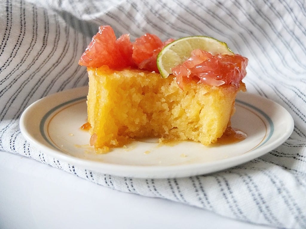 A la sortie du four : démoulez les 4 gâteaux, décorez avec les morceaux de pamplemousse rose de Floride et arrosez bien de sirop. C’est prêt ! Si vous tentez la recette, je serai ravie de lire votre avis en bas de cet article !