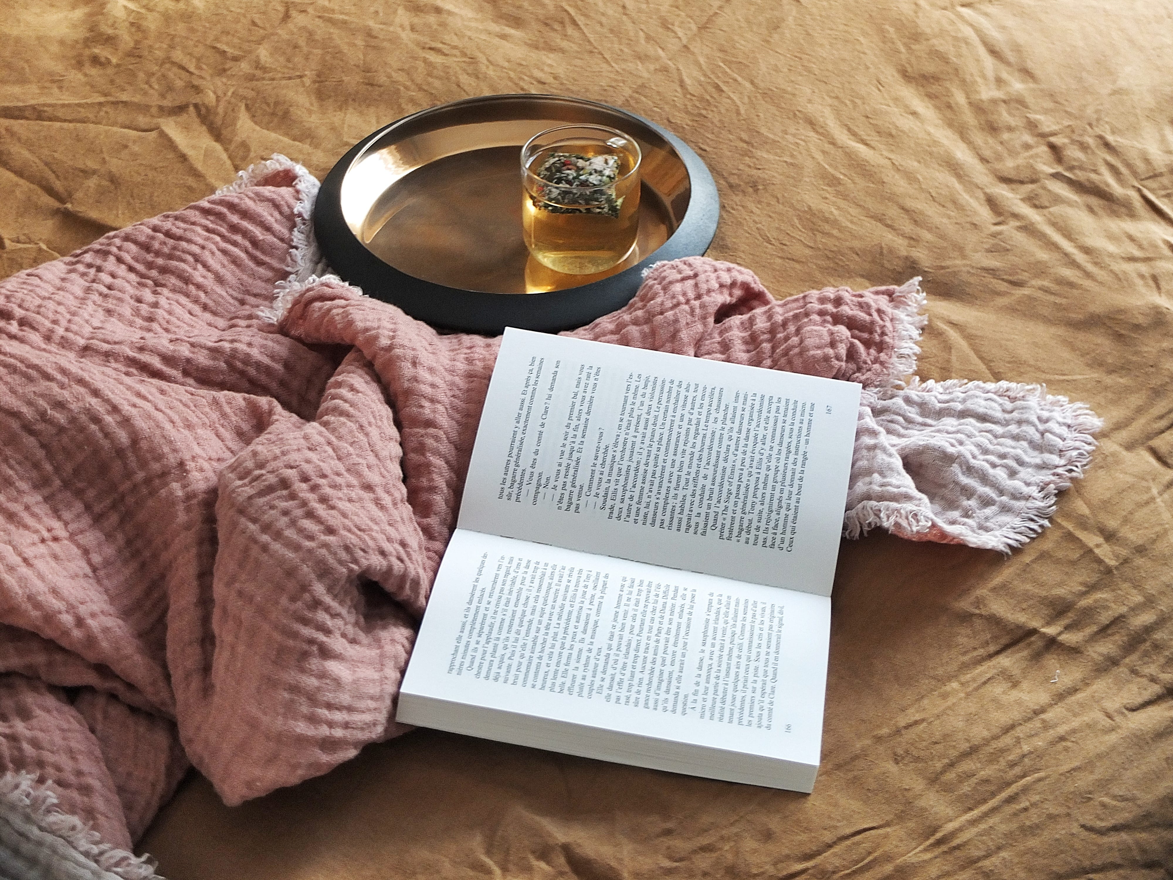 Les images sont sublimes …. Et je fond devant ce plaid rose qui a l’air tellement doux… avec le moutarde du drap c’est parfait.