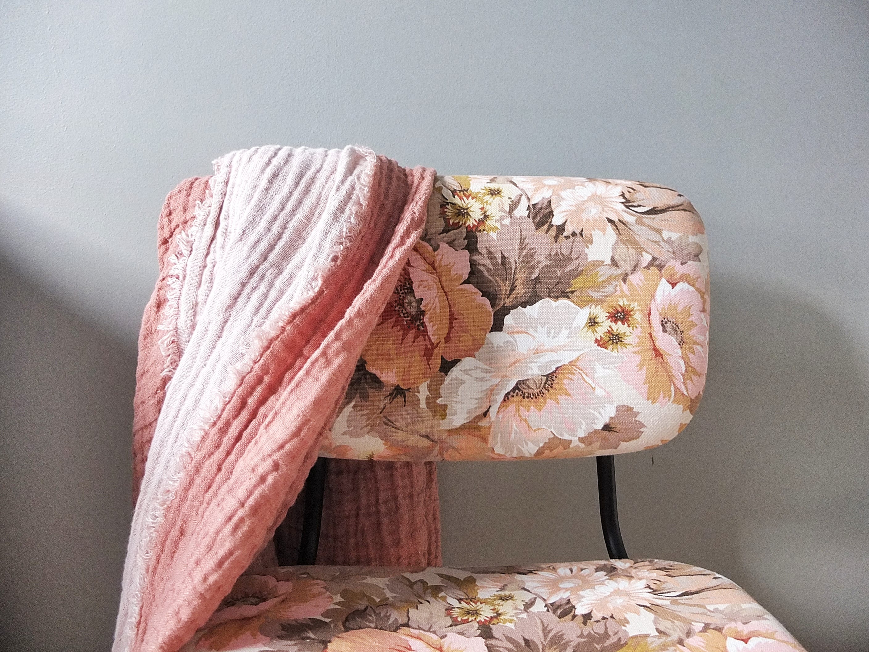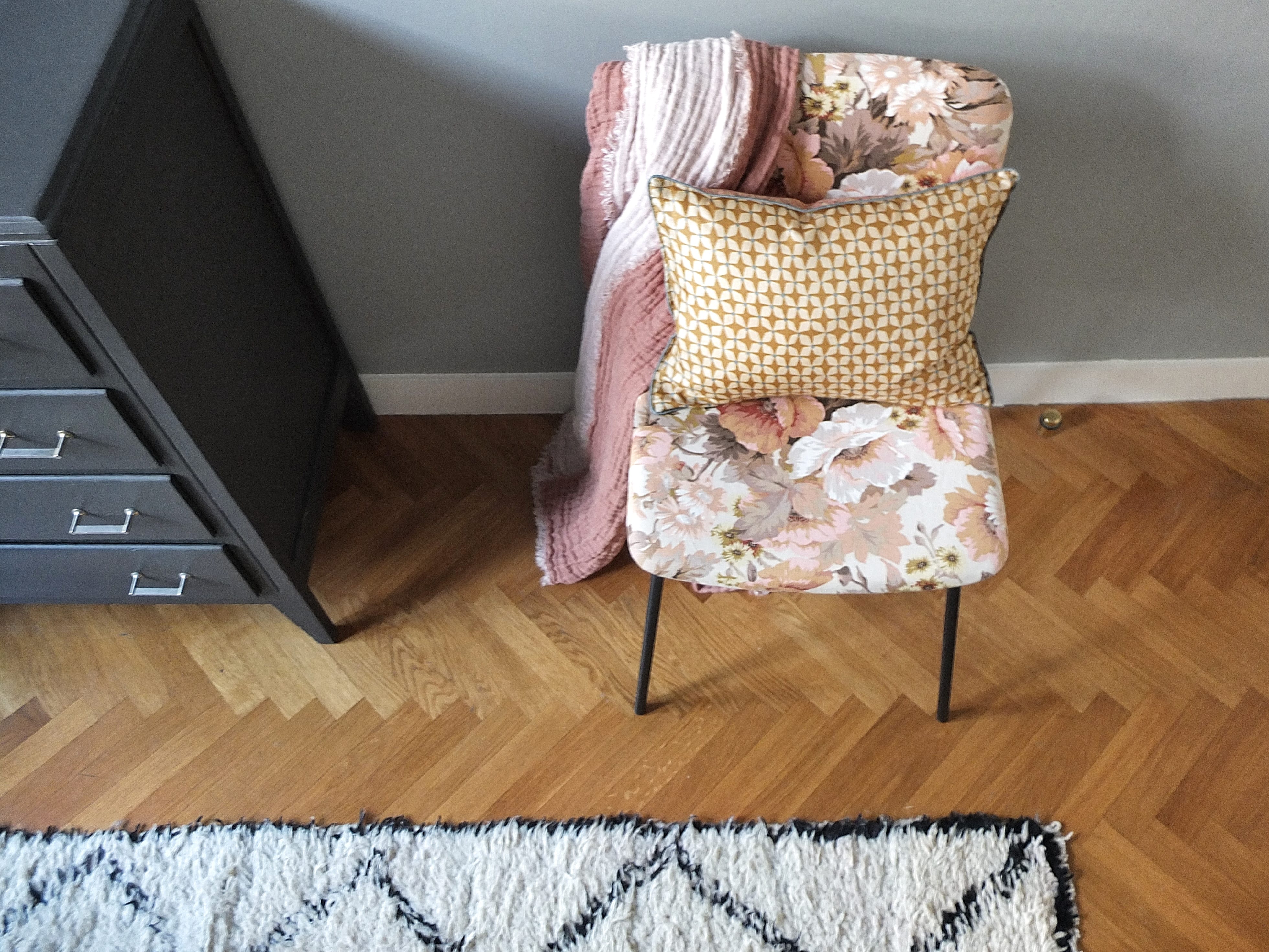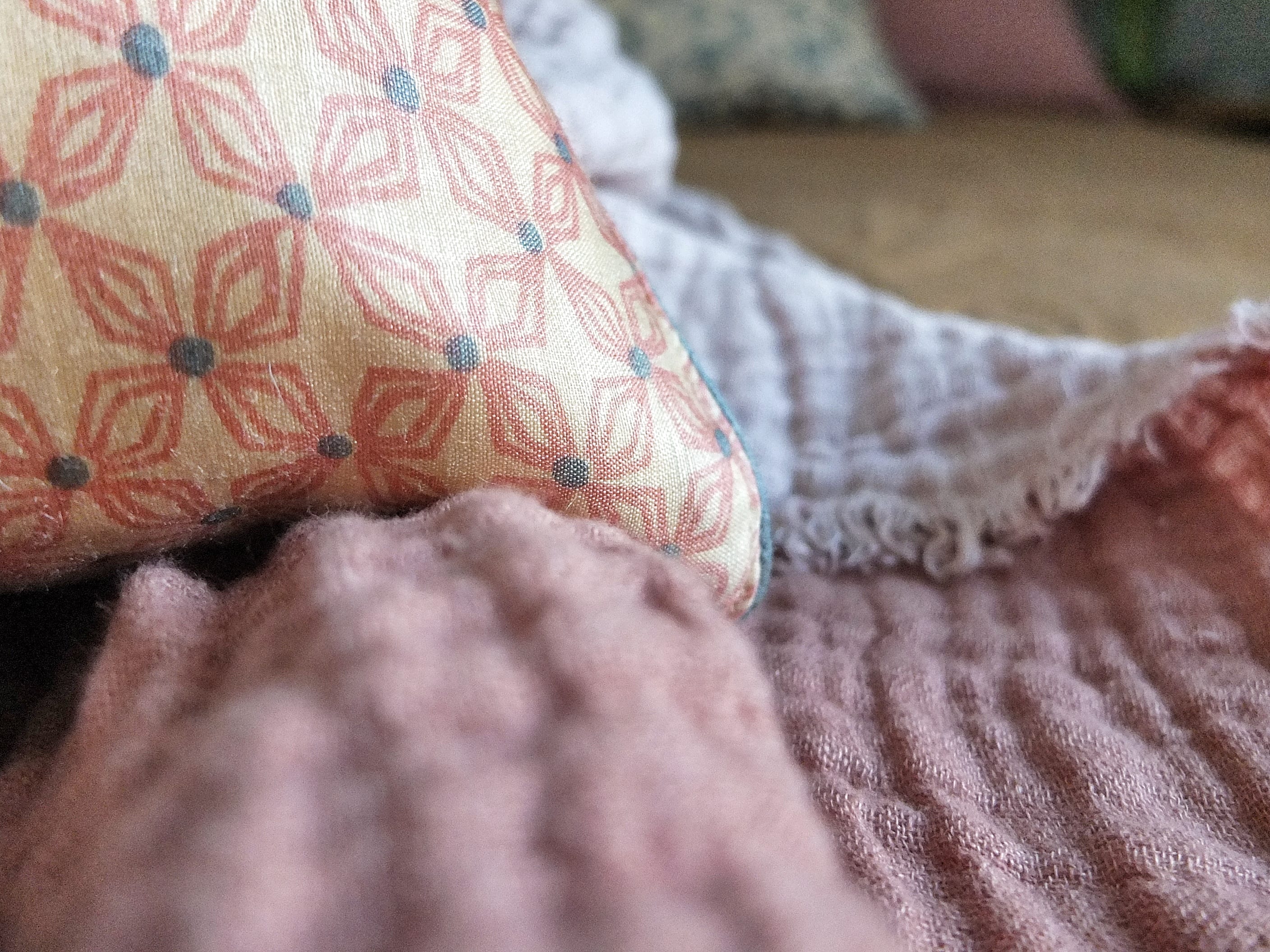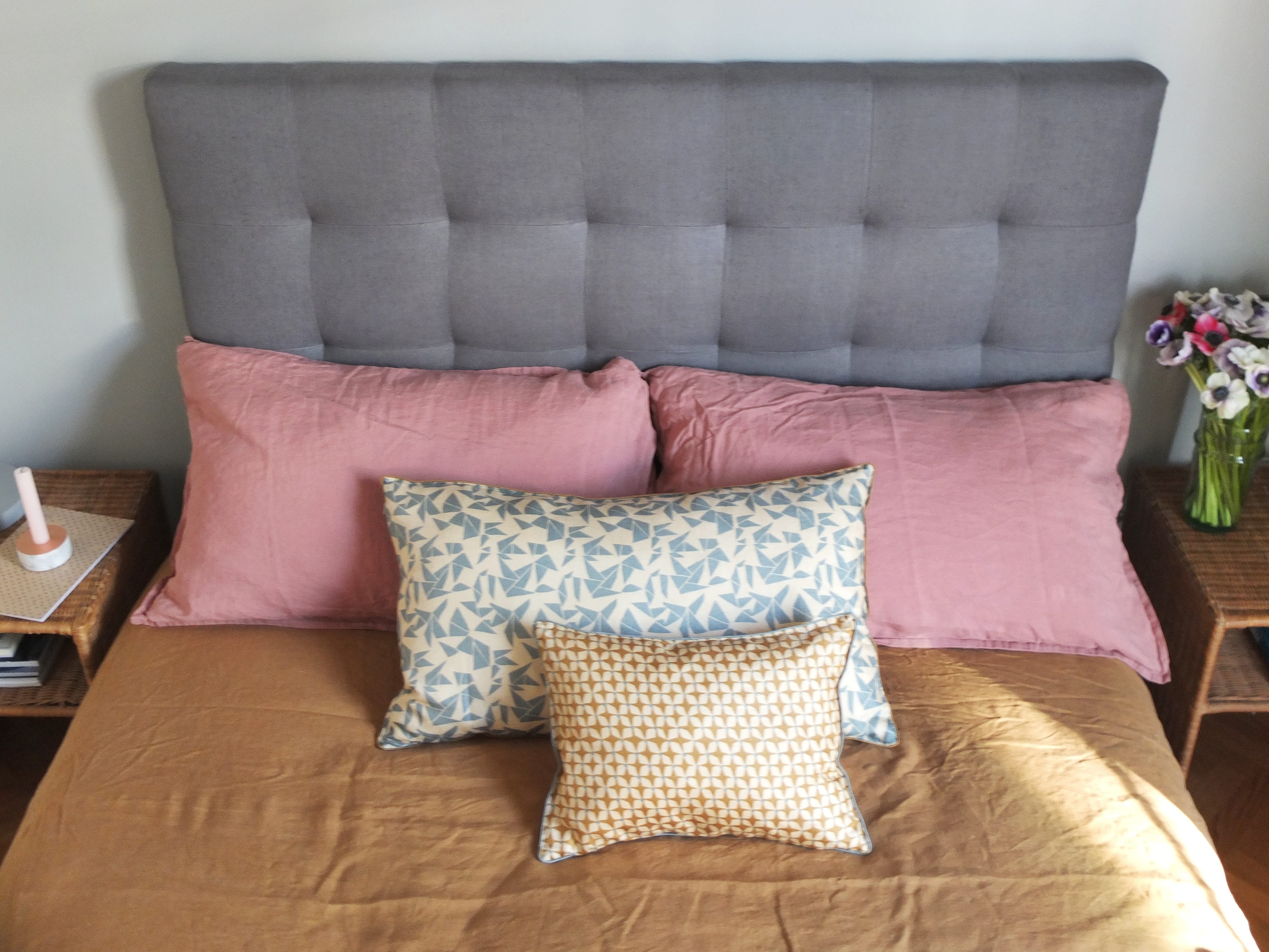 Wouhou ! J’adore tes couleurs !C’est doux et chaud et cosy, au top ! Je suis en mode jaune et rose poudré aussi dans mon atelier, mais avec les tons de gris c’est classe ! Ah oui, et les matières aussi, c’est quoi, du lin ?