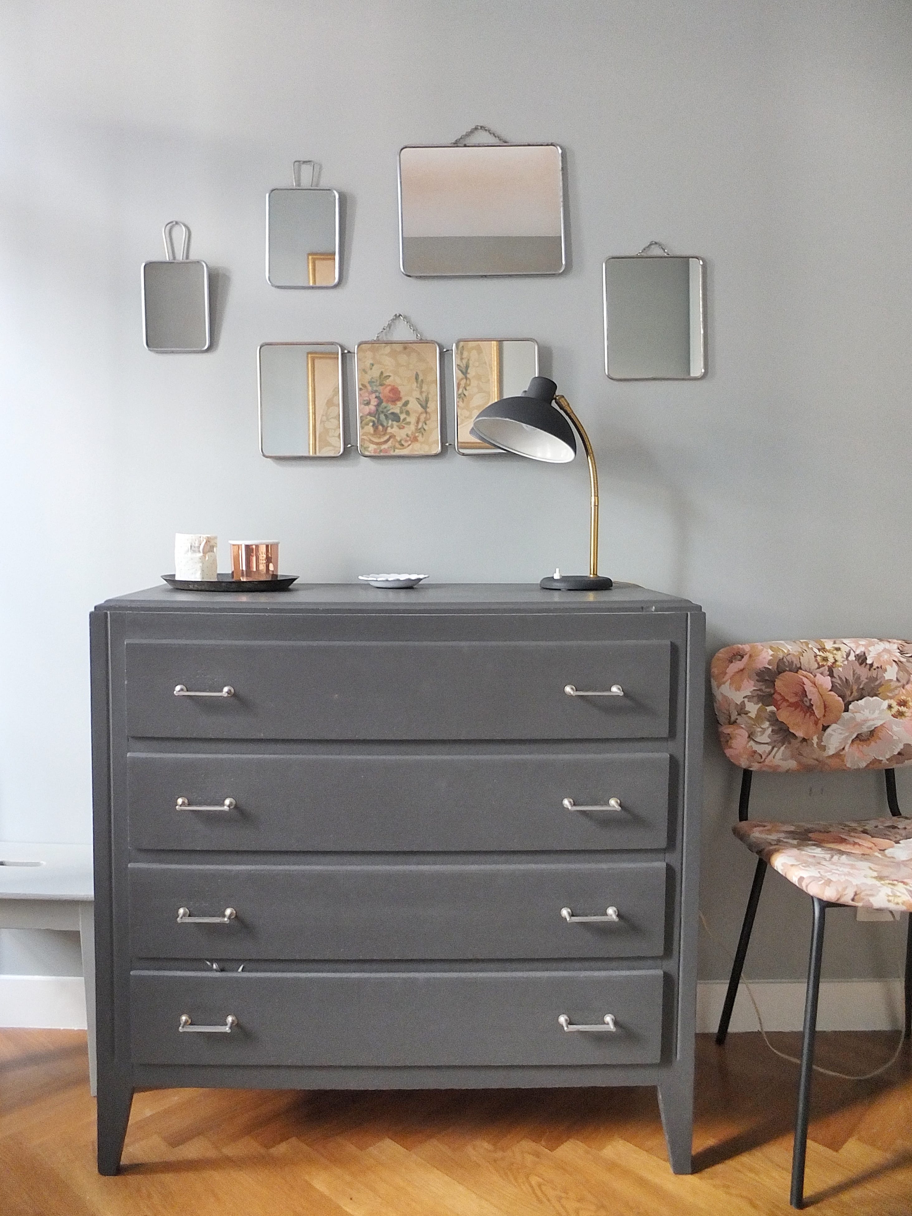 Une très très belle décor. J’aime énormement l’association de toutes ces jolies couleurs. Du moderne avec un effet vintage. J’aime aussi beaucoup la disposition de tes miroirs.
